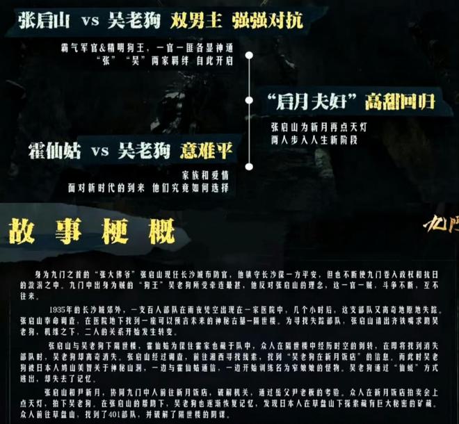 《九门》聚焦1935年的长沙城,围绕张启山调查日军秘密部队失踪事件展开,涉及时空倒转、古墓预言、家族情仇等元素。这种充满神秘和悬疑色彩的故事背景,为剧情增添了许多看点。