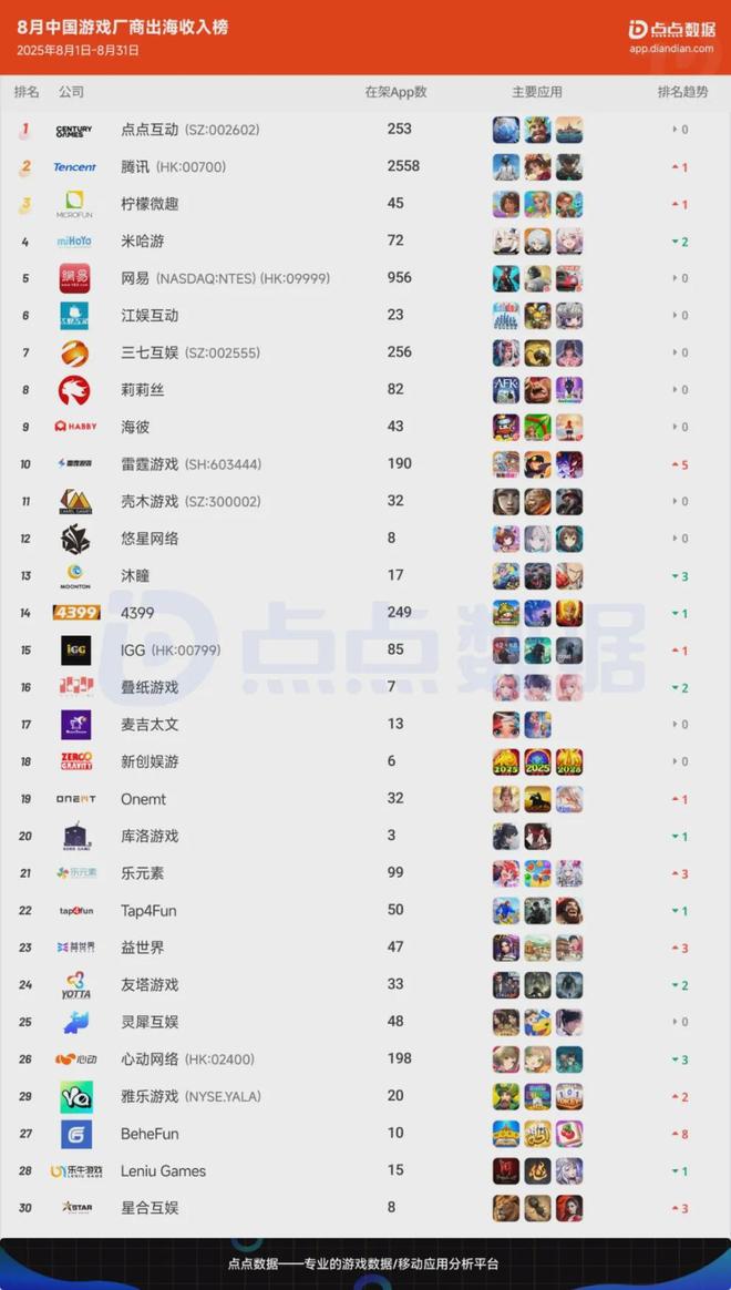 不过,即使如此,游戏厂商积极探索游戏增长新曲线的热情却是在持续升温,通过对8月中国游戏厂商出海收入TOP30榜单的分析,我们注意到雷霆游戏、星合互娱、BeheFun(匠心趣游)交出了让人惊喜的短期成绩单。