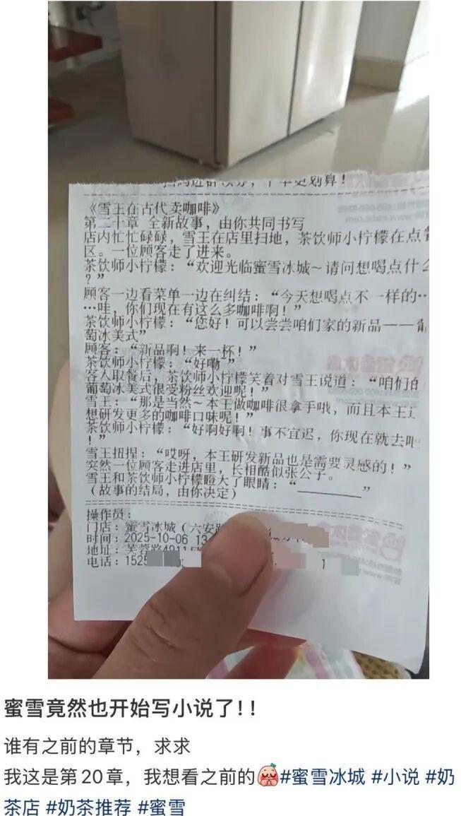 该网友称“想看之前的(章节)”。帖子一经发出迅速引发关注,评论区成了“章节交换站”:不少网友晒出自己拍到的其他章节,有人调侃“大家拼拼凑凑,我仅花0元就看完了全文”,还有网友点赞品牌创意,直言“蜜雪招到了很会运营的小朋友啊”。