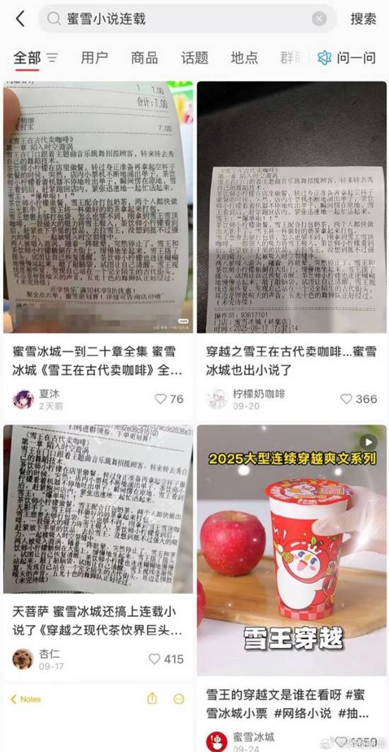 据界面新闻报道,近日,九游有网友在社交平台发帖称,“蜜雪竟然也开始写小说了!”其在购买蜜雪冰城时发现小票上印有连载小说,篇名为《雪王在古代卖咖啡》,讲述了“雪王”与伙伴小柠檬穿越至古代经营咖啡店的故事。