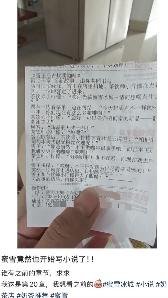近日,有网友在社交平台发帖分享自己购买蜜雪冰城时发现小票上印有连载小说,