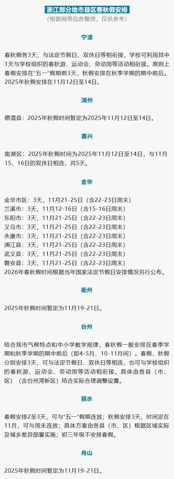 浙江省教育厅基教处处长李斌称,浙江中小学春秋假不仅有十余个部门联合保障推行,且尊重区域差异和学段差异,由各市、县(市、区)结合区域实际,因地制宜、弹性安排方案。