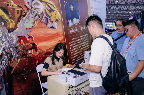 在 WF2025 的 52TOYS 展位,《猛兽匣:金属之歌》小说作者、曾荣获中国科幻银河奖最佳新人奖的科幻作家王诺诺被粉丝层层环绕。小说以其精美的装帧与引人入胜的设定,刚亮相便让资深玩家与科幻爱好者眼前一亮,纷纷将其列入收藏清单。现场等候签售及购买的粉丝排起长龙。