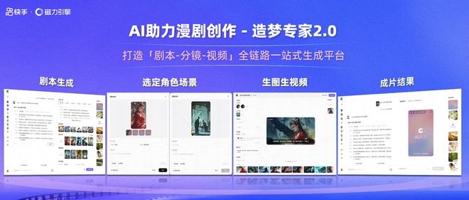 当下,漫剧的制作方也面临着生产事项多、成本高、周期长等痛点,漫剧的产能受到限制。针对此,快手全新推出“造梦专家2.0”平台,从剧本生成、分镜解析、选定角色场景、生图生视频、成片结果等全链路,以AI助力漫剧创作效率提升,突破漫剧产能瓶颈,缩短制作周期,降低人力和资金等生产成本。