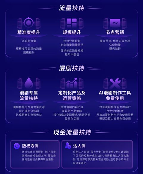 为进一步挖掘漫剧潜力,快手将推出全方位、大力度的扶持政策,为创作方提供现金、算力、流量等支持,携手共建漫剧生态。目前,快手更是拿出了接近100%利润分成给到合作方,全面助力漫剧赛道健康多元发展、突破生意天花板。
