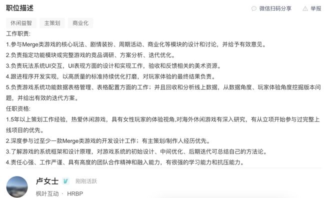 九游官方门户网站九游官方门户网站近期,DataEye研究院观察到,枫叶互动近期在BOSS直聘上发布招聘消息,工作职责要求“参与Merge类游戏的核心玩法、剧情装扮、周期活动、商业化等方面设计”。