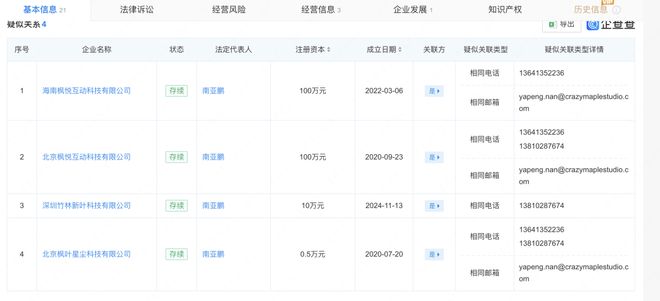 爱企查显示枫叶互动在2018年时便在深圳创建星尘游戏科技有限公司,企业标榜为「新一代游戏/阅读风口领航者」。