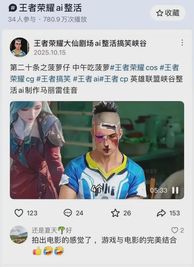3、漫剧:这类型的“动态漫”时长较短,整体品质较为简陋,AI拼接明显,内容以“整活”“搞怪”为主,与第一种的动态漫剧有明显差异。近期在抖音平台上就有话题“王者荣耀AI整活”,相关播放量接近800万。