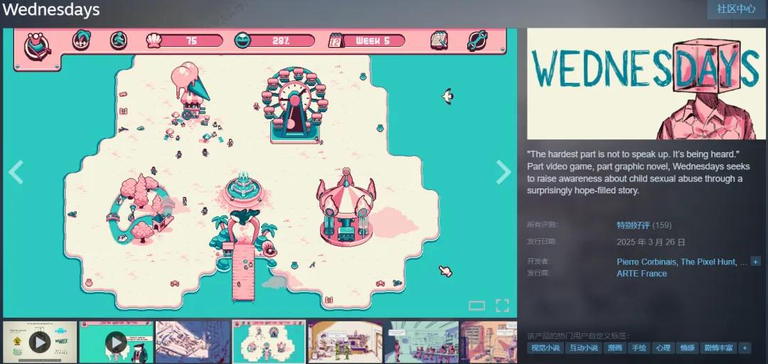《星期三(Wednesdays)》是一款具有社会关怀意义的叙事探索游戏,游戏讲述了主角蒂姆在成年后,通过重温童年游戏《奥尔科公园》,逐渐唤醒并修复其被压抑的童年创伤记忆的过程。