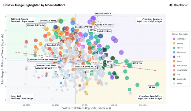 数据显示,价格和使用量之间相关性极弱。真正的高端用户对价格不敏感,而低端用户只认那几个「性价比神机」。夹在中间的平庸模型,死得最快。6. 中国模型的进攻才刚刚开始