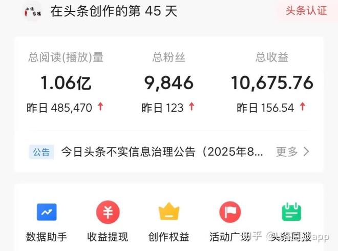 通过发布微头条内容,获得流量分成盈利,阅读量越高收益越多,优质内容还能获平台额外奖励。每天发 2-5 条,流量稳定的,单月收入 1-3 千比较正常,赚点生活费没问题。偶尔可能会有爆款,收入也可能过万。