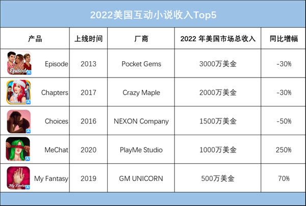 过往,如果要按营收划分海外互动小说的话,分别来自美中韩的三款产品《Episode》、《Chapters》、《Choices》属于第一梯队(《Chioces》及其研发商已被韩国游戏公司 NEXON Company 收购,ps:韩国公司真的在内容相关产业各种布局),与其余产品的营收几乎不在一个量级。但是情况在 2022 年有了一些变化,一是在美九游官网国市场,头部产品的营收集体下滑,年营收同比降幅在 30%- 50% 不等;其次,像《MeChat》这一类近年发布的新产品营收涨势强劲,在美国市场年营收已突破千万美金大关。一降一升,《MeChat》与头部产品已经处于同一量级。在和一位互动小说从业者交流时,他也表示,美国的确变化较大。