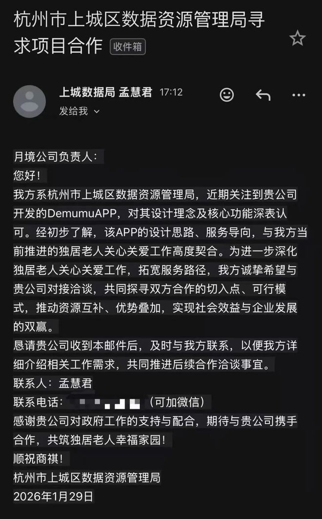 在她看来,这封邮件是一场基于业务感知的“自我推荐”。她关注到APP对独居群体的安全守护,恰好上城区在独居老人智慧养老场景上已有探索。于是,她以一个朴素的逻辑写下了邮件:我们有共同的关注点,上城有可落地的场景和空间,如果合作,或许能探索出更好的未来。