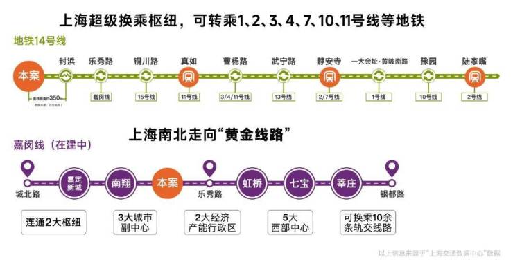 交通能级不断跃升:14号线和嘉闵线(在建中)双轨交汇,直线号线号线站普陀,直达静安,且始发有座,出行舒适;黄金走廊嘉闵线站虹桥枢纽,未来可速达七宝、徐家汇、莘庄等核心区域。项目周边开泰路即将建成,绿野谷二期路段、骏达路、童家桥路、昌瑞路、涟澜路已启动建设,预计2026年建成。