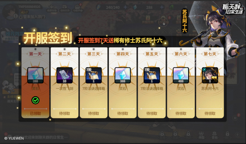 开服七日签到,每日签到即可领取灵石、十连抽、七阶法决,第七日还可以可领取稀有雷系修士苏氏阿十六!大家还记得【开服狂欢】活动中有送苏氏阿十六永久时装“清韵竹熊”吗?这下连人带时装都可以尽情收入囊中啦!