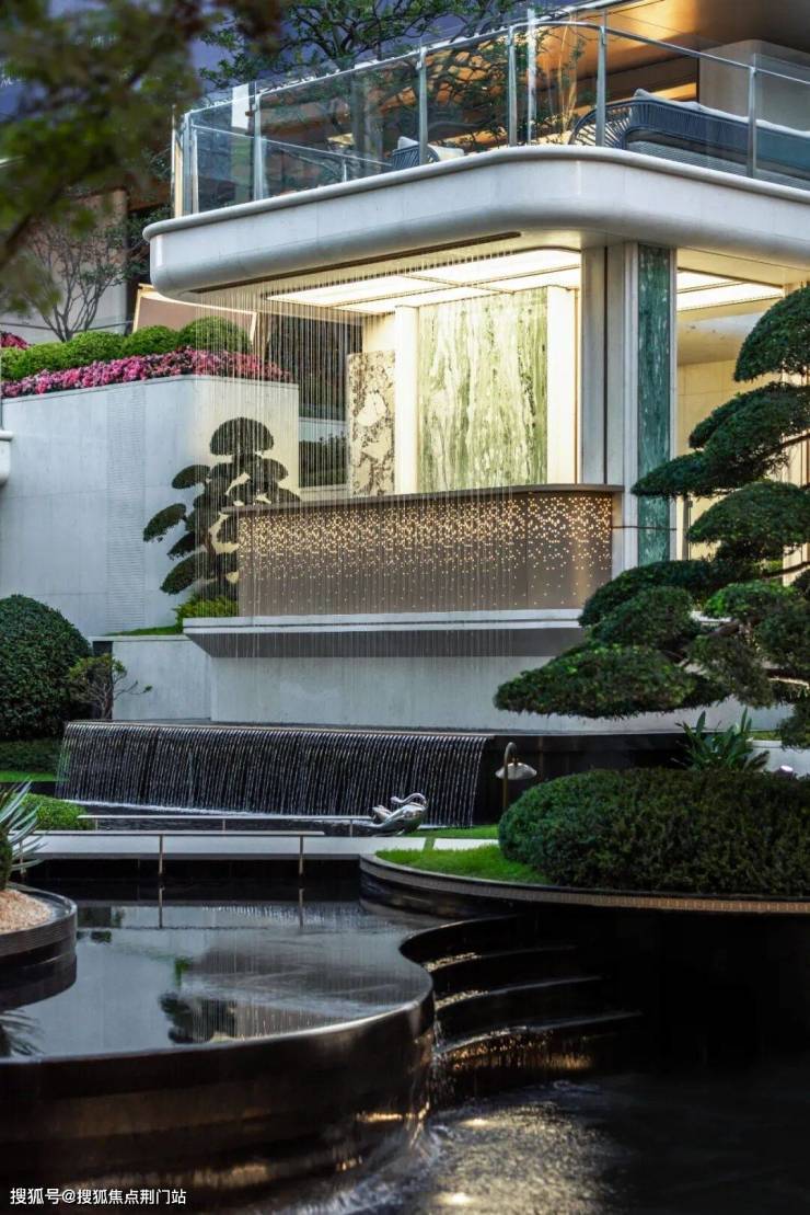 如果近距离看,项目的入口细节之处又不是奢华,尤其是大面积的奢石运用(梵高白奢石+古驰黑石材),绝对是大手笔,再搭配四根梵高白立柱托起古铜色铝板,层层抬升,豪宅大院的气质扑面而来。