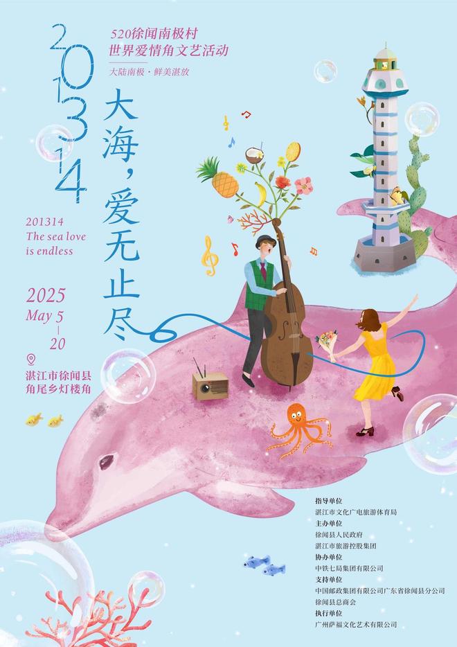 极地飞鸿,山水长情。极地之美,世界看见。2025年5月20日,一场专注、唯美、传神、浪漫的文艺之夜——“201314,大海,爱无止境”于中国大陆最南端的徐闻县角尾乡南极村举行。此次活动由徐闻县人民政府、共青团湛江市委员会、湛江市旅游控股集团主办,是“大陆南极-鲜美湛放”为主题的系列文旅活动之一。湛江正在打造一批“湛品”品牌产品,逐步形成代表“鲜美湛江”风貌特色的文旅品牌体系。同时通过大陆四极联动,深化与各地文旅产业协同发展,吸引全国游客到湛江“冬休避寒”“滨海度假”。