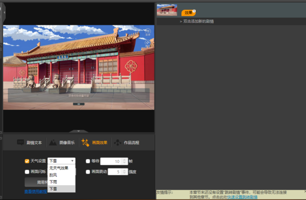 想要使用橙光文字游戏制作工具画面特效的小伙伴,可以在打开橙光文字游戏制作工具并转到对应的作品剧情中之后,点击作品预览框下方的“画面特效”键。在弹出的选项中,选择需要添加的特效,比如说天气、画面震动、闪烁等。
