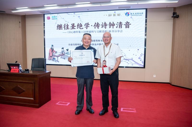 肖晓阳向福建省图书馆赠送新书《诗心磨杵集》《诗钟通则与文献选粹》(主办方供图)