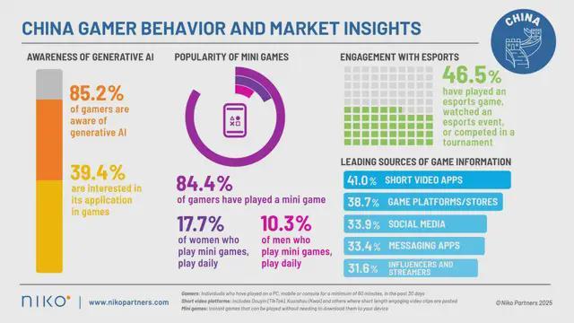 其中中国工作室则在这方面处于领先地位,据Niko Partners在八月最新发布的《中国游戏玩家和市场洞察》报告显示,中国60%的工作室已经在其开发管道中使用生成式人工智能。