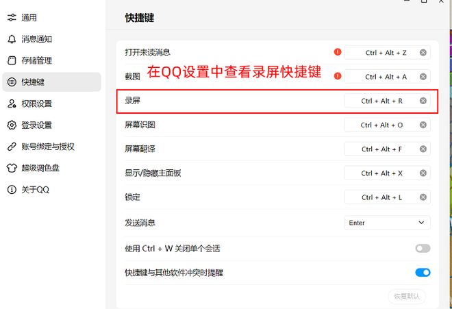 步骤1.打开电脑版 QQ,登录后按快捷键(Ctrl+Alt+S)唤醒录屏功能(或通过 “设置 - 辅助功能 - 屏幕录制” 打开);拖动鼠标选择录制区域,顶部工具栏可设置音频来源(系统声音 / 麦克风 / 关闭)和标注工具;