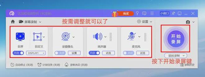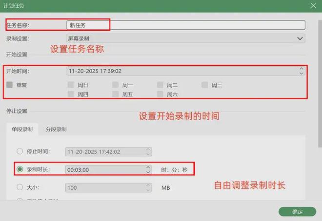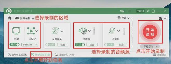 步骤2:打开后可以根据需求调整参数,先锁定录制区域,然后勾选对应的音频源就行。若是不想手动启动,可以开启“计划录制任务”,设置好时间后软件会自动开始,十分省心。