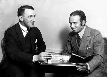 约瑟夫·巴布科克(左)和道格拉斯·费尔班克斯与麻将销售公司早期的一套高定产品合影留念。照片中,费尔班克斯正在翻阅巴布科克的《麻将规则红皮书》。麻将牌装在一个细节精美的木盒中,上面有风景如画的雕刻。照片由克里斯托弗·伯格提供。图片为《麻将》插图。