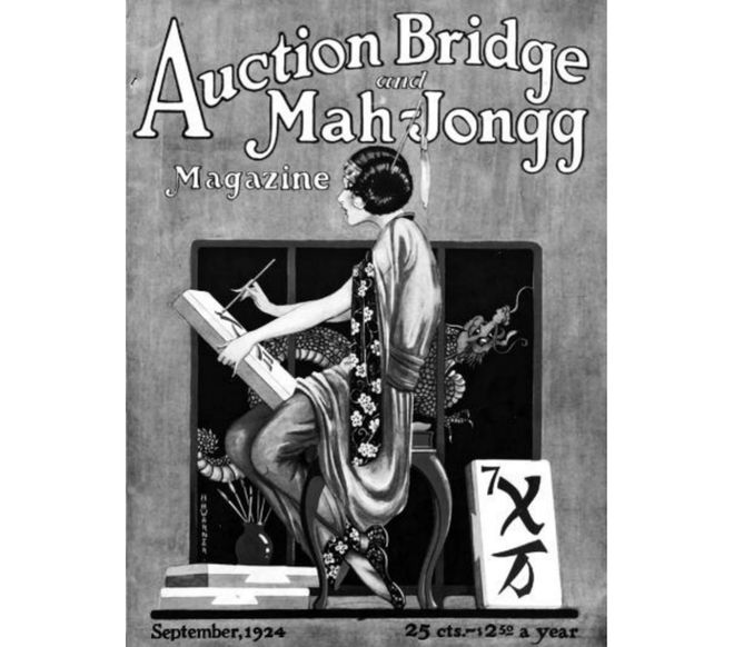 在杂志封面上,一个穿着仿中式服装的白人女子正在一个大于实物的麻将牌上绘制图案。她身后的金色中国龙屏风散发出迷人而又不祥的光芒。美国国会图书馆。图片为《麻将》插图。