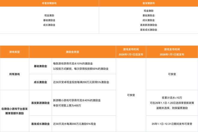 1.原【新游激励金】升级为【首发新游激励金】,2026年1-6月发布的新游激励上限最高提至400万元/款,7月1日后发布的新游激励上限为240万元/款。