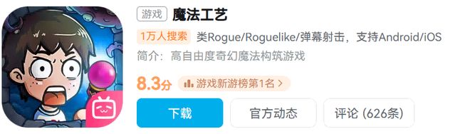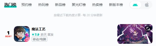 在Android端,《魔法工艺》在bilibili游戏中心下载量为7.9万,taptap平台下载量为10万,均登顶平台热门榜。