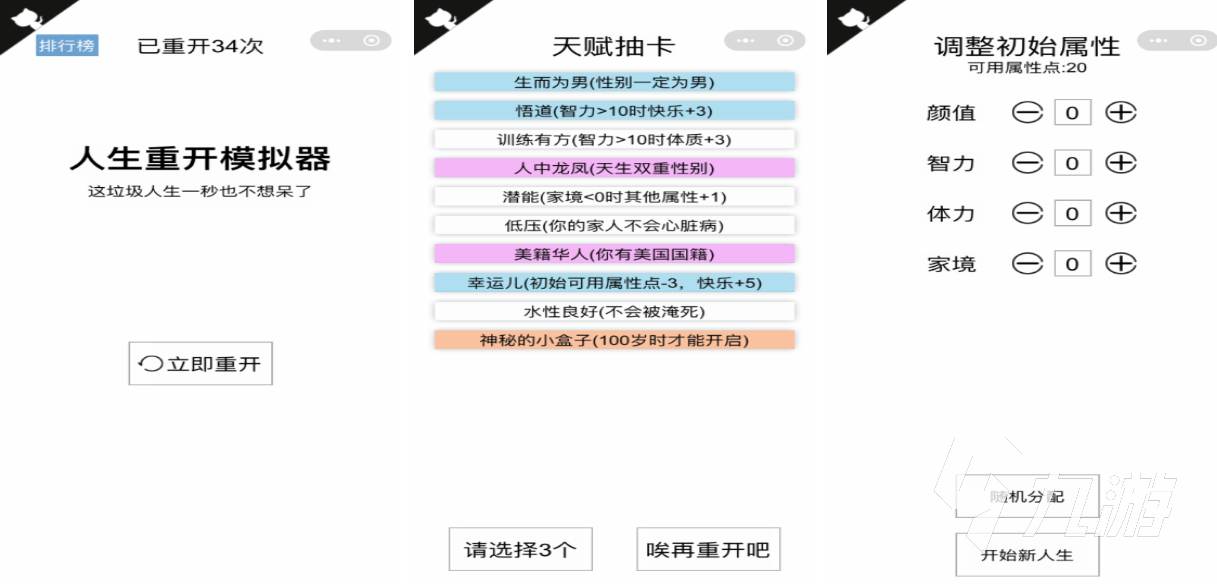 现实世界中很多人的生活都是非常失败的,在这款游戏中你可以重新定义自己的理想人生,前期可以通过抽卡的方式为自己获得一些独特的技能,就连颜值、身体健康等属性你也可以自定义,在这款文字叙述的游戏中你将重新开启一段非常独特的人生,文字叙述式的玩法给人一种阅读小说的畅快感,喜欢玩模拟人生手游的朋友安装人生重开这款佳作吧。