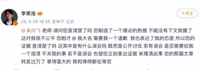 不少人当时就看出来,吴向飞这波是卡点蹭热度,就是想搅乱舆论,把李荣浩维权的正面形象毁掉,帮单依纯分流压力。谁知道李荣浩反应快得离谱,才过了34分钟就给出了强硬回应。他直接要求吴向飞明确说清,侵权发生在哪一年哪一场什么场合,还明确否认自己在个人演唱会、音乐节、商业晚会这类商用场合唱过这首歌。他还放话,只要吴向飞能拿出实打实的证据,他愿意公开道歉全额赔偿,连律师都在线等着收材料,一点不带虚的。