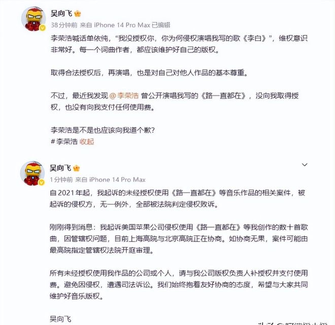 本来这事舆论全站李荣浩,全网都在聊版权保护的重要性,谁知道半路精准杀出个吴向飞。吴向飞是陈奕迅经典歌曲《路一直都在》的词作者,赶在当天17点15分发文,说要拿李荣浩自己的维权逻辑反过来锤他。他开口先讲自己支持版权维权,转头就指控李荣浩公开唱《路一直都在》没拿授权没给钱,要求李荣浩公开道歉,还特意强调自己2021年起的版权诉讼全部胜诉,摆明了就是要给李荣浩添堵。