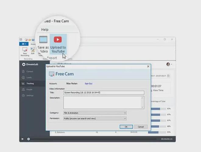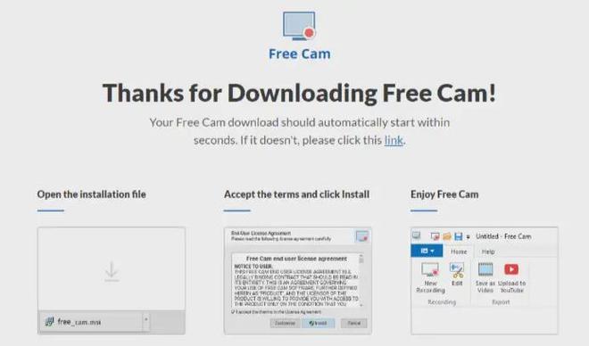 Free Cam具备灵活的录制功能,用户可以自由选择全屏、特定区域或单个窗口进行录制。录制完成后,视频可以直接保存到桌面,也可以快速分享到YouTube平台,对于新手用户来说非常友好。