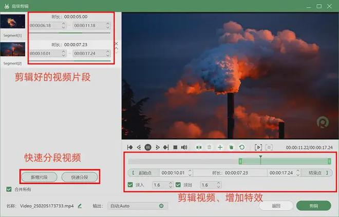 步骤3:录制结束后,建议进入高级剪辑页面进行内容优化。可添加淡入淡出特效至视频首尾,让画面过渡更自然;若录制内容中存在卡顿或不必要的片段,使用删除功能精准删除,该功能操作简单,新手也能快速上手规避录制失误。