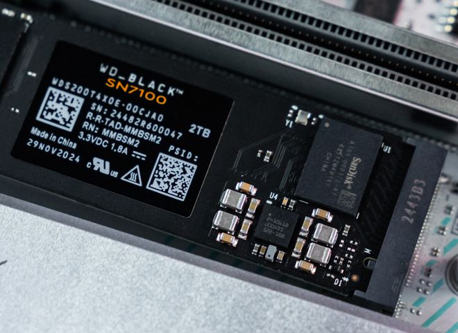 拿到WD_BLACK SN7100的第一印象,包装上的橙色底部条形设计与产品名、容量标志成呼应,也让用户一眼就能捕捉到这款产品的关键信息点。打开产品包装,可以看到Sandisk闪迪自研主控和闪存颗粒,并采用了与上一代WD_BLACK SN770相同的M.2 2280尺寸规格的单面DRAM-Less设计,保证了兼容性。