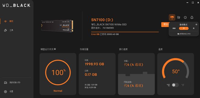 我们知道,WD_BLACK作为专为游戏玩家而生的品牌,WD_BLACK SN7100同样针对卓越游戏进行了优化,以极快的读写速度助力游戏玩家提升强劲游戏体验。所以在使用和测试之前,选用WD_BLACK仪表板开启游戏模式,即可获得更畅快的体验。(可通过链接:下载)