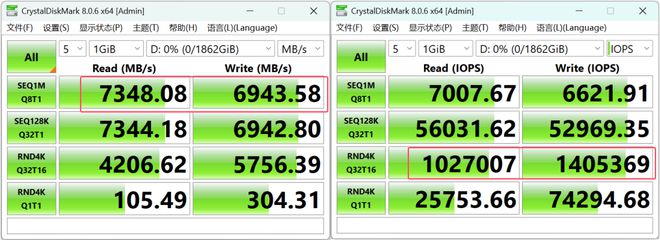在CDM测试中,WD_BLACK SN7100顺序读取速度高达7348.08MB/s,顺序写入速度同样达到6943.58MB/s;而4K随机吞吐量实现了1027007 IOPS读取和1405369 IOPS 写入。这样的表现,在应对游戏数据包加载、大量密集型素材处理时,能够提供高效的处理。
