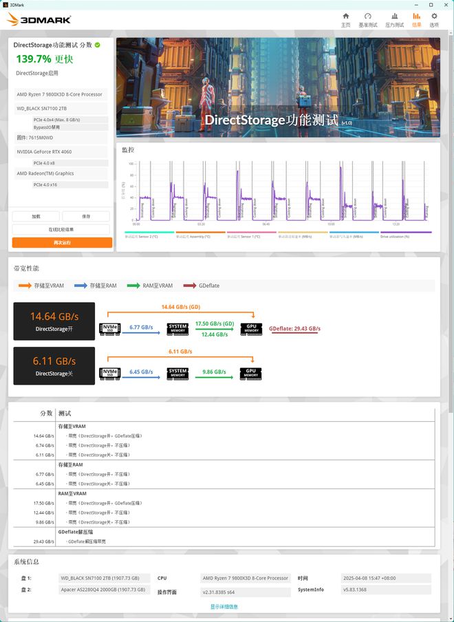 在PCMARK10完整系统盘测试中, 运行了系统启动、应用程序/游戏启动、复制多个大文件和许多小文件、Office和Adobe应用程序运作时的硬盘轨迹等。WD_BLACK SN7100得分3510,在快速系统盘基准测试中达到4272分,数据盘基准测试时为6006分,在同类PCIe 4.0 SSD中表现优秀。